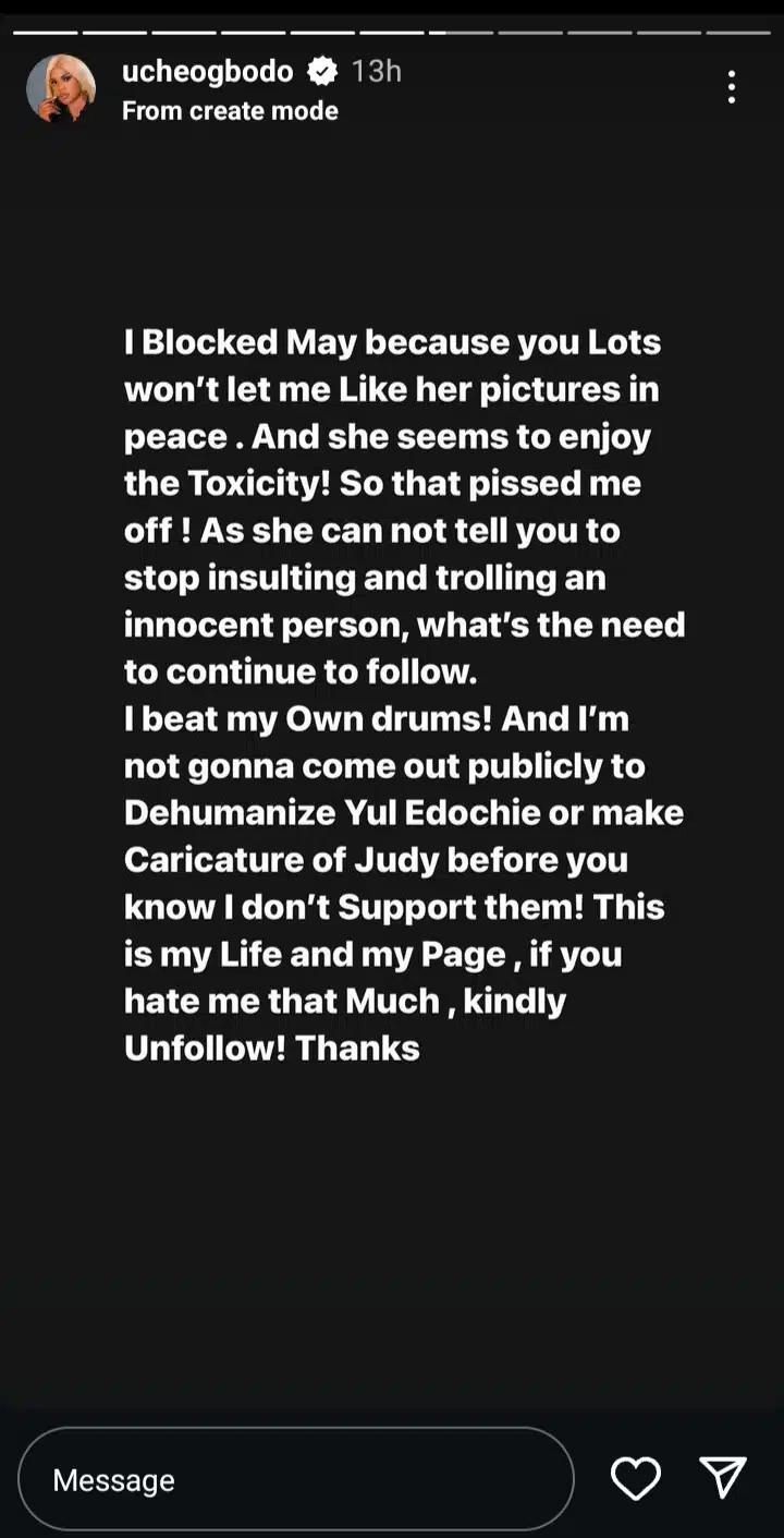 Nollywood actress Uche Ogbodo has clarified why she decided to block May Edochie, the estranged wife of Yul Edochie, on social media.