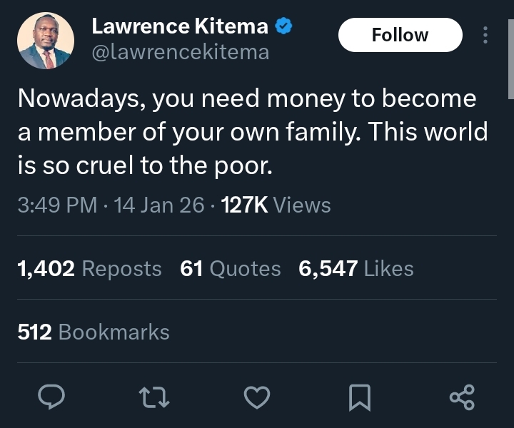 In a post shared on X (formerly Twitter), Lawrence Kitema expressed frustration over what he described as increasing cruelty toward people who are financially struggling. According to him, money has become the ultimate measure of worth, overshadowing values like compassion, loyalty, and family bonds.