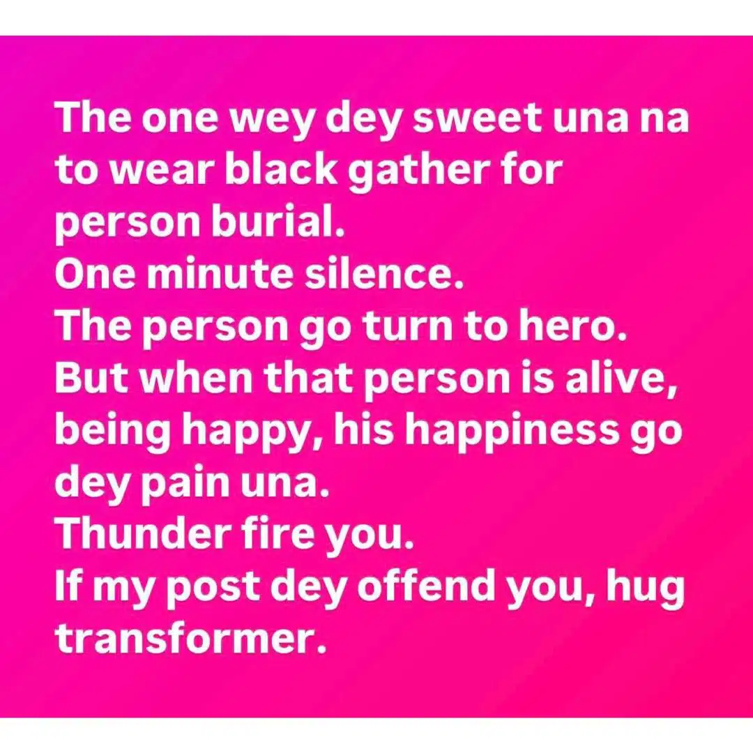 “The person go turn hero. But when the person is alive, being happy, his happiness goes dey pain una. Thunder fire una. If my post dey offend you, hug transformer.”