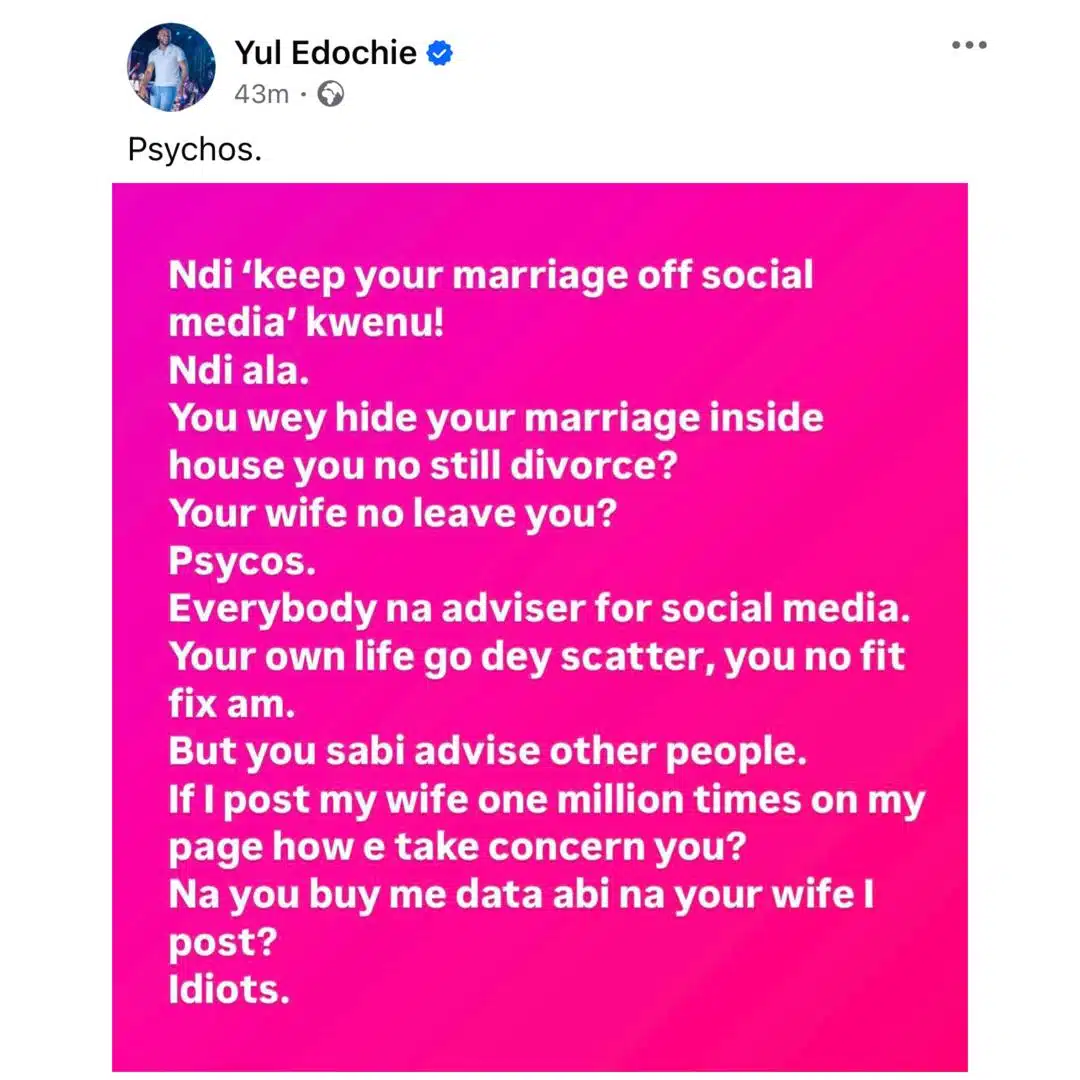 “Ndi keep your marriage off social media, Kwenu! Ndi ala. You wey hid your marriage inside the house, you no still divorce? Your wife no leave you? Psychos. everybody na advice for social media. Your own life go dey scatter, you no fit fix am but you sabi advise other people.